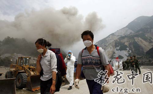 居民離開(kāi)映秀鎮(zhèn),背后升起爆破拆除房屋而產(chǎn)生的濃煙。記者 韓億國(guó)攝 (來(lái)源:彩龍中國(guó))