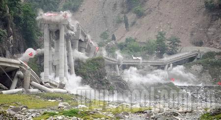 隨著“轟”的一聲巨響,被地震震毀的百花大橋殘余橋體轟然倒下。(來(lái)源:四川在線(xiàn))
