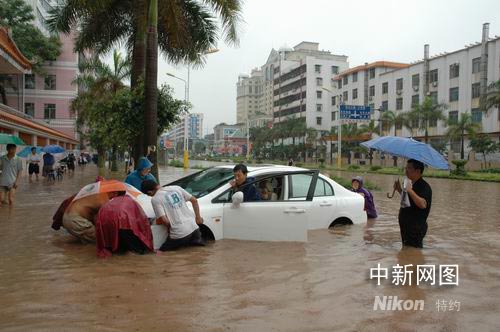 受高空槽和切變線共同影響,六月五日至六日,廣東茂名各地出現(xiàn)明顯強(qiáng)降水過(guò)程,全市日降雨量均值八十五毫米。由于降雨量大且強(qiáng),致使茂名市局部地區(qū)出現(xiàn)洪澇和山體滑坡災(zāi)害,并導(dǎo)致高州古丁鎮(zhèn)一名九歲男學(xué)生及一名十四歲女學(xué)生失蹤。據(jù)統(tǒng)計(jì),這次暴雨成災(zāi),茂名全市有六個(gè)縣區(qū)八十一個(gè)鎮(zhèn)約六十萬(wàn)人受災(zāi),倒塌房屋近千間,直接經(jīng)濟(jì)總損失二億元人民幣。圖為茂名市區(qū)幾成澤國(guó)。 中新社發(fā) 梁盛 攝