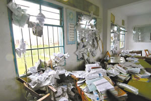 龍卷風把教師辦公室內的課桌、書籍等吹得一片凌亂。
