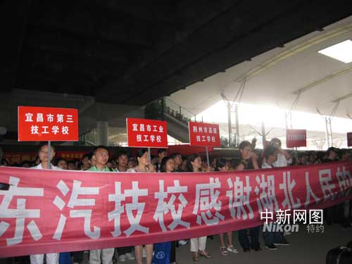 “我們都是你親人”、“熱列歡迎新同學”、“鄂川人民心連心”,7日的武昌火車站一號站臺,前來迎接這批學生的湖北技工院校師生高舉溫情的標語。每個學校還專門安排了迎接接收學生的校車,并整齊地停在站臺上。當四川技校生一踏上車站,即刻被站臺上熱情的人們所包圍。來自湖北各地的技工院校,將災區(qū)學生分別有秩序地帶領到各自對口接收學校的校牌下集中,排成整齊的隊伍,并點名清點人數(shù)。