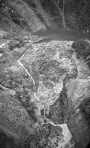 俯拍的唐家山堰塞湖泄流情景。昨日7時,唐家山堰塞湖開始泄流。楊衛(wèi)華 攝