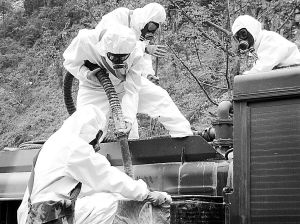 今天(22日),成都軍區某集團軍防化團又一次在北川縣城進行洗消。與以往不同的是,官兵穿著的防護服由原來的淺綠色變成了白色。據該集團軍防化團團長謝志榮介紹:“除了顏色不同外,新一代防護服既具有以前防護服的功能,還具有透濕、抗靜電、抗皮膚刺激、耐洗消、物理機械性能好等特點,可長時間穿著和作戰。”