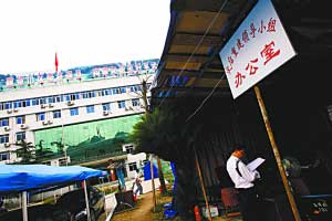 昨日,平武縣政府大院,辦公室人員在帳篷里處理事務。政府大樓已經成為危房。 本報記者 秦斌 攝