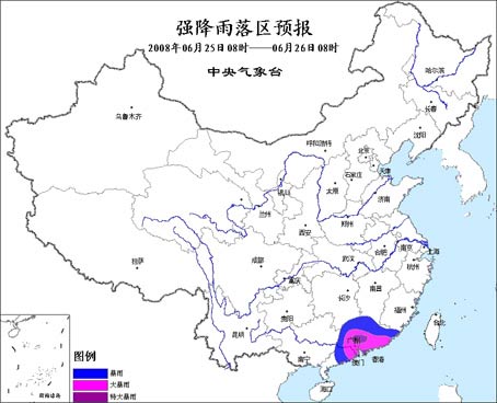 預計今天白天到夜間,廣東大部、福建東南部、江西南部、湖南東南部有暴雨,廣東中東部局部地區有大暴雨或特大暴雨。