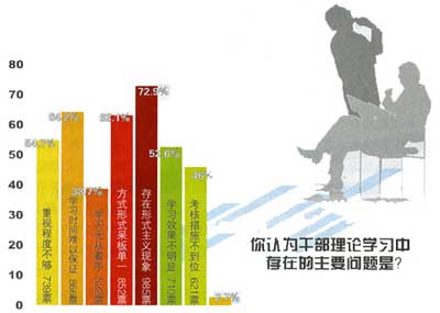 “就你的感覺,干部對理論學習的總體態度如何?”問卷調查結果顯示,72.6%的受調查者表示“只是政治任務,應付而已,談不上興趣”或“形式主義嚴重,可有可無”。“你認為干部理論學習中存在的主要問題是什么?”排在第一位的是“存在形式主義現象”占受調查者的72.9%。