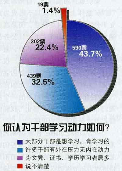 本次調查結果顯示,干部在工作中的感受,58.3%的受調查者認為尚能應對,能力與新任務與時俱進,31.5%的受調查者表示緊張,壓力大,有精力透支現象。而在“本單位的干部選拔任用、職務/職稱晉升中,下列哪些因素的作用影響最大?”的問卷調查結果顯示出,排在前三位的是:工作能力(占總73.5%)、群眾關系(占總68.2%)、領導關系(占總63.4%)。相當部分的干部認為能力已能應付工作,這也就部分地解釋了干部學習動力不足的原因。