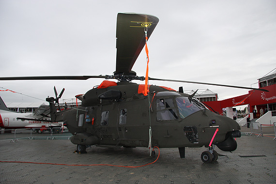 純軍用型筆者在現(xiàn)場(chǎng)只看到了一架丹麥陸軍最新購(gòu)買的EH-101 Mk512默林直升機(jī)。該機(jī)的機(jī)鼻向上方翹著,看起來(lái)很可愛(ài)。