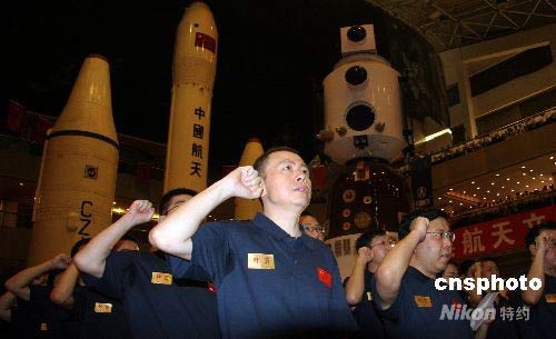 中國運載火箭技術研究院二百多名“神箭”發射試驗隊隊員列隊面向國旗宣誓,“長征二號F”運載火箭總設計師荊木春代表發射試驗隊表示,有信心、有決心確保“神七”運載火箭發射圓滿成功。隨后,發射試驗隊隊員們都拿出寫好的“承諾卡”,依次上前粘貼于一塊專門的展板上,莊嚴承諾“確保成功,確保安全”。