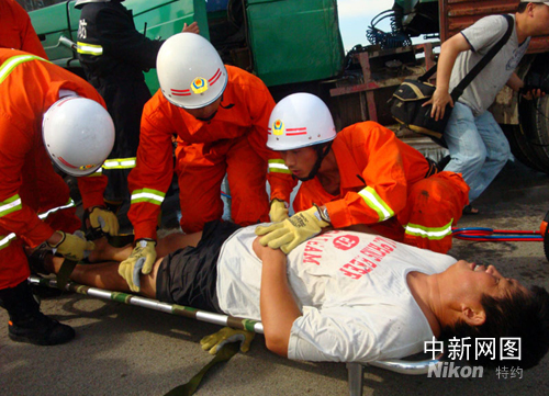 大橋消防中隊接到報警后,立即出動三輛消防車15名消防官兵趕赴出事地點。8時36分到達事故現場,此時,空氣中彌漫著濃濃的柴油、機油味道,發動機處還向外冒著黑煙。指揮員迅速展開災情偵察,組織搶險車人員利用液壓破拆器材解救被困人員,A類泡沫車人員出兩支泡沫槍滅火掩護,重型水罐泡沫車組織供水。動作迅速,操作熟練的消防官兵只用了5分鐘的時間就成功將駕駛員救出,并在第一時間抬上救護車送往醫院。