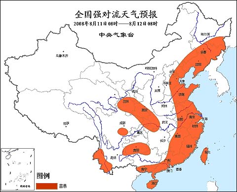 2008年8月11日08時(shí)—12日08時(shí)全國(guó)強(qiáng)對(duì)流天氣預(yù)報(bào)