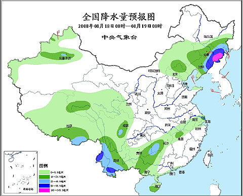 2008年8月18日08時—8月19日08時 全國降水量預報圖