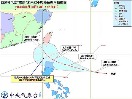 預計強風暴中心將以每小時20-25公里的速度向西偏北方向移動,強度繼續加強,逐漸向臺灣東南部海面靠近。受其影響,19日白天,巴士海峽、巴林塘海峽、臺灣以東洋面的風力將逐漸加大到6-8級。