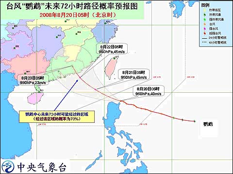 命令稱,“鸚鵡”(Nuri)的中心今天8時位于臺灣恒春市東南偏南方向約370公里的海面上,即北緯18.7度,東經122.0度,中心附近最大風力有13級(40米/秒)。預計,臺風中心將以每小時15至20公里的速度繼續向西偏北方向移動,強度還將有所加強,將于今天夜間進入南海東北部海面,然后逐漸向廣東中部到福建南部一帶沿海靠近。