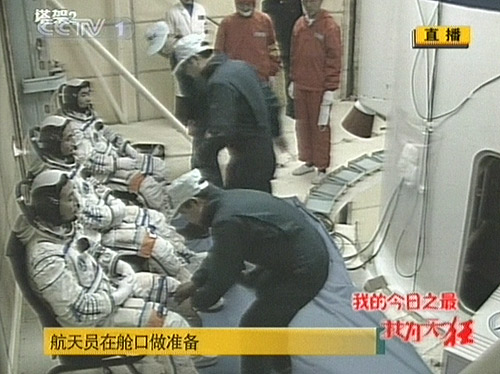 中新網9月25日電 據中央電視臺直播報道,神七航天員正在艙口做準備,將陸續進艙。據此前報道,“神七”三名航天員翟志剛、劉伯明、景海鵬將于18點15分左右陸續進艙。