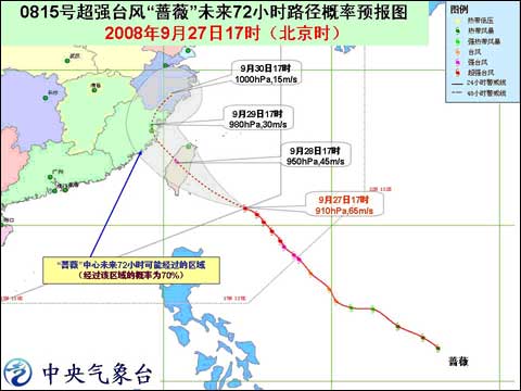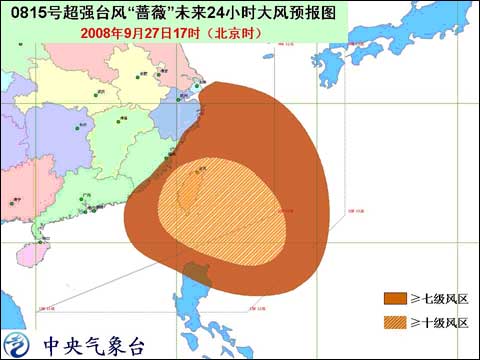 中新網(wǎng)9月27日電 據(jù)中國天氣網(wǎng)消息,中央氣象臺2008年9月27日18時發(fā)布臺風(fēng)紅色警報(bào)稱:預(yù)計(jì),今年第15號超強(qiáng)臺風(fēng)“薔薇”將以每小時20-25公里的速度向西北方向移動,逐漸向臺灣東部一帶沿海靠近,將于明天中午到夜間在臺灣宜蘭到臺東一帶沿海登陸。