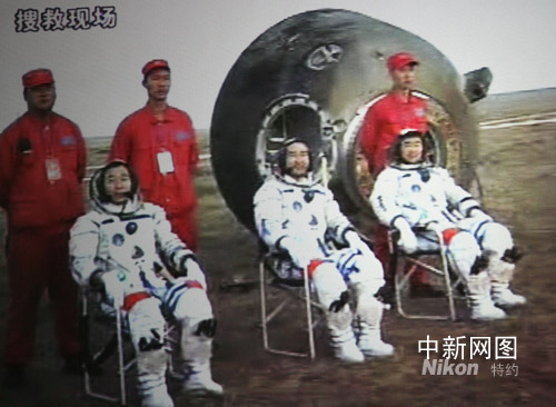 中新網9月28日內蒙古四子王旗“神七”主著陸場電 題:中國“飛天三杰”駕駛“神舟”踏云歸
