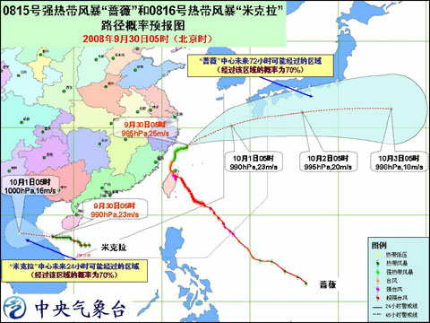 預計,“米克拉”將以每小時20公里左右的速度向偏西方向移動,逐漸向越南東部沿海靠近,將于今天上午在越南廣平省(Quangbinh)一帶沿海登陸。受其影響,今天白天到夜間,南海西北部海域、海南西南部沿海、北部灣將有7-8級大風,風暴中心經過的附近海面風力可達9-10級。南海中南部海面有5-7級大風;海南將有中雨,局部地區有大雨。