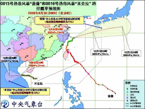 熱帶風暴“薔薇”與“米克拉”路徑概率預報圖