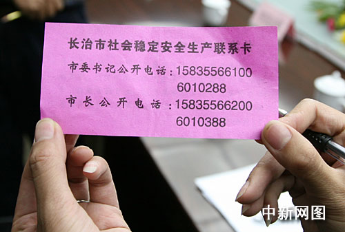 長治書記市長“名片”的全稱是“長治市社會穩定安全生產聯系卡”。長治市市委書記杜善學在接受記者采訪時說,當初推出這樣一個舉措,實際上是為了抓安全生產。他說,長治這幾年在安全生產方面取得了不錯的成績,但是安全生產需要常抓不懈,怎抓都不夠不過分,所以市委市政府才出臺這樣的舉措。