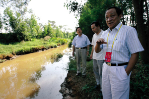 三位暗訪的省人大代表在排放口仔細觀察。“這里肯定存在偷排污水現象,否則怎么會淤積這么厚的黑泥?”省人大環資委副主任委員潘大林說。他還指給記者看,排放口上游河岸兩邊是黃泥,到下游就變成黑色,水面也開始漂浮油污。