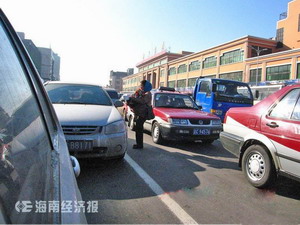 在海口市城區(qū)主要街道口,每當(dāng)紅燈亮起車輛停下之際,就會(huì)有一些人竄到車流當(dāng)中,他(她)們用手中拿著的碗或托著的缽,逐車挨個(gè)敲打著車窗玻璃,目的是為了討要鈔票。