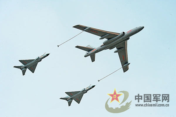 率先登場的是轟油—6空中加油機。遠遠望去,只見3個黑點成“品”字形向觀眾區(qū)飛來。不一會兒,飛在前面的轟油—6空中加油機伸出兩根錐套式軟管,兩架殲—8D戰(zhàn)斗機略一加速縮短與加油機的距離,到約1米間隔時保持住速度,緊緊跟隨在加油機左右兩側(cè)。望著在500米高度上慢速飛來的加受油機編隊,現(xiàn)場觀眾雖然知道空中的飛行員根本聽不到地面上的聲響,但仍然報以熱烈的掌聲。