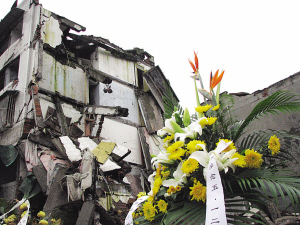 “這里已經(jīng)是一座空城”。當(dāng)?shù)厝耸恐钢鴿h旺鎮(zhèn)的原址告訴記者說(shuō)。當(dāng)?shù)氐卣鹗軗p最為嚴(yán)重的順河路甚至已被封鎖,有來(lái)自無(wú)錫的警察在此值崗,以防止意外發(fā)生。但看起來(lái)昨日還是有人到過(guò)這里,在漢旺鎮(zhèn)中心幼兒園的廢墟前,一個(gè)新鮮美麗的花籃異常醒目。