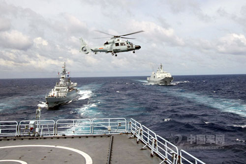 海上戰(zhàn)艦馳騁,空中戰(zhàn)鷹盤旋。11月上旬,南海艦隊(duì)組織支援艦、登陸艦、驅(qū)逐艦、護(hù)衛(wèi)艦、艦載直升機(jī),首次在南沙附近海域開展了一次綜合作戰(zhàn)支援演練。他們在成功組織“兩橫一縱”海上補(bǔ)給訓(xùn)練的同時,演練了艦載直升機(jī)起降、懸停、偵察、模擬救援等課目,使艦機(jī)協(xié)同能力有了新的提高。(中國軍網(wǎng)發(fā) 饒燕文攝)