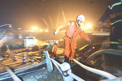 “馬路突然下陷,路面傾斜成了六七十度的坡。我把握不住方向,摩托車直接撞上了路邊的隔離墩。我感覺整個大地都在震動,周圍的塔吊也都傾倒了!苯饑w說,當時他完全懵了,“我第一反應就是拿出對講機向隊里匯報情況!眳R報完情況,金國飛趕緊往路面上爬,然后在現場參與了一夜的救援。