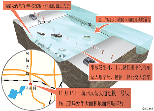 截至16日中午11時30分,浙江省杭州市風情大道地鐵一號線施工現場塌陷事故已造成3名施工人員死亡,17人失蹤,入院救治19人。