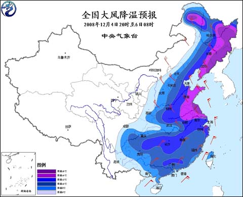 中央氣象臺2008年12月4日18時繼續發布寒潮橙色警報: