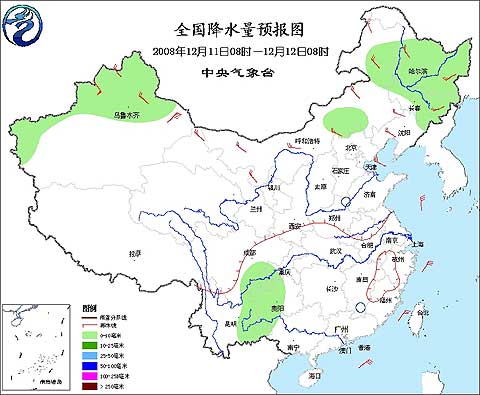 2008年12月11日08時(shí)—12月12日08時(shí)全國(guó)降水量預(yù)報(bào)圖