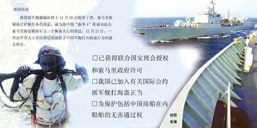 中央軍委法制局有關負責人在接受媒體采訪時說,中國軍艦赴亞丁灣、索馬里海域實施護航的行動,是根據聯合國安理會決議作出的決定,完全符合有關國際法的規定。