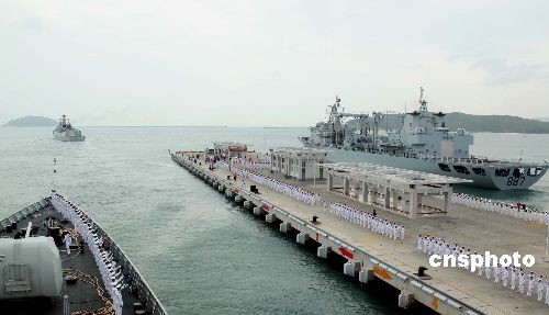圖為中國人民解放軍海軍艦艇編隊陸續駛離碼頭。中新社發 孫自法 攝