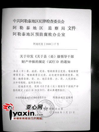阿勒泰地區(qū)官員的財產(chǎn)申報制度,始于去年5月的一份《縣(處)級領(lǐng)導干部財產(chǎn)申報的規(guī)定(試行)》(下稱《規(guī)定》)。這份文件的起草人和主推者即吳偉平。
