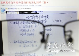 “過年了,企業開始送錢了!”6日,天涯論壇重慶社區、重慶記者之家等網站驚現一份給公務員、檢驗站的“送禮清單”。這份清單共涉及20個紅包,個個上千元,最高2000元。