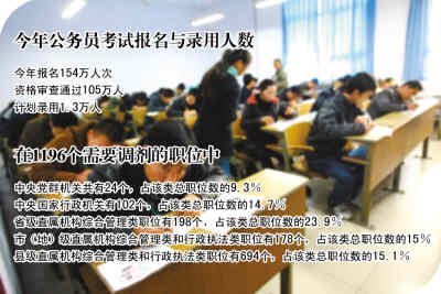 在7555個職位中,共有1196個職位沒有合格人選,或者合格人選未達到規定面試比例,其中有586個職位報考人數本身就未達到規定的面試比例,甚至無人報考。主管部門分析發現,這些職位主要是艱苦、邊遠、基層職位和專業特殊的職位,也有部分職位是由于設置不合理的資格條件,導致報考人員和過線人員較少。