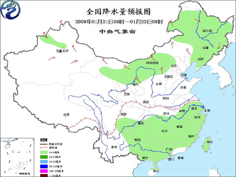 中央氣象臺2009年1月21日6時發布未來三天天氣預報: