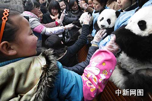 中新社成都一月二十七日電 (記者 鄒輝)中國農歷大年初二,來自都江堰的十七名因汶川大地震新增的“三孤”人員,受邀來到成都大熊貓繁育研究基地:參觀大熊貓產房、品嘗大熊貓專用“窩頭”、同大熊貓親密接觸合影留念……度過了一個獨具意義的春節。