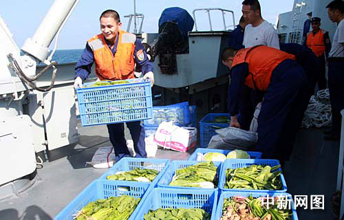 “海口”艦官兵搬運(yùn)補(bǔ)給到艦上的新鮮蔬菜。 中新網(wǎng)記者 孫自法 攝