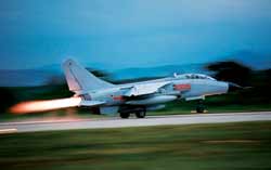 “1號請求起飛。”“按計劃執行。”一切準備就緒后,塔臺指揮員干凈利索地下達了命令。18時25分,該團團長李軍第一個駕駛“飛豹”戰機沖向跑道。頓時,機場上響起巨大轟鳴聲,震得記者耳朵嗡嗡作響。滑行,加力,起飛,戰鷹閃著亮光騰空而起,噴著橘紅色的尾焰直沖蒼穹,最后消失在茫茫夜色之中。