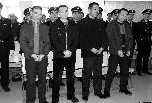 昨日,四名被告人在法庭宣判現(xiàn)場。從左至右依次為范志國、崔海龍、朱春東、朱松巖。當(dāng)天,黑龍江省慶安縣人民法院對慶安縣公安局四刑警故意傷害案作出一審判決。新華社記者 程子龍 攝