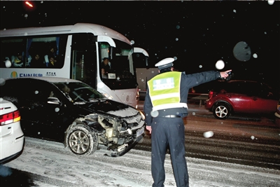 昨天,(北京)市交管局于清晨6點和晚高峰時分別啟動三級雪天疏導方案,加派3000名警力上路維護疏導。由于路面濕滑車速變慢,事故有所增多,傍晚雪情使晚高峰時間有所延長。昨晚8點開始,京津塘、京津第二高速、京沈高速先后被封閉。