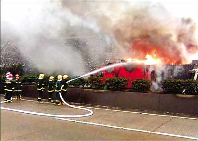 據(jù)交警介紹,車(chē)禍發(fā)生時(shí),一輛貨車(chē)滿載打火機(jī)及洗發(fā)水等易燃易爆物品,因此火勢(shì)很猛,車(chē)上不時(shí)傳來(lái)打火機(jī)的爆炸聲,碎片不斷地從車(chē)廂內(nèi)飛出,貨車(chē)的油箱也處于被烘烤狀態(tài),隨時(shí)有爆炸的危險(xiǎn)。