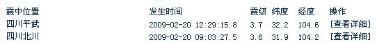 據(jù)地震臺網(wǎng)測定,北京時間2009-02-20 12:29:15.8在四川平武(北緯32.2,東經(jīng)104.6)發(fā)生3.7級地震。