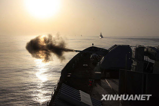 17時45分,海上實彈射擊浮體靶演練開始。17時58分,在急促的戰斗警報聲中,“廣州”艦實施主炮射擊。隨著一聲驚雷般巨響,該艦“海外第一炮”首發命中,擊沉3.5海里外的浮體靶,完成了“廣州”艦此行最主要的演習課目——海上實彈射擊,實現了既定目標。在場觀摩的巴基斯坦和澳大利亞海軍觀察員當即向中國海軍官兵豎起了大拇指。組織該課目演練的指揮艦——英國皇家海軍“波特蘭”號指揮官專門給“廣州”艦發來賀電,稱贊中國海軍“干得好”。指揮員陳岳琪說:“這是我們所希望的,也是我們努力的結果。參演官兵為國家、為海軍爭了光!”