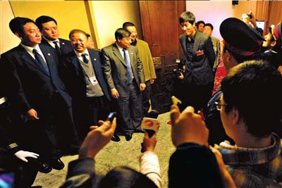 小組討論還未開始,21世紀(jì)飯店三樓第七會議室門口已擠了上百名記者。由于會議室太小、記者太多,大家都不能進(jìn)去旁聽。攝影和攝像記者10人一組,3分鐘一輪,進(jìn)場拍攝;而文字記者則只能將錄音筆送進(jìn)會場。會議室里一下子放了30多個錄音筆。