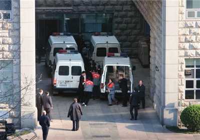 昨天上午8點,由4輛囚車組成的車隊呼嘯而至市二中院,進門后徑直開到了審判大樓的后面。囚車停穩后,趙鵬運等28名被告人被逐一帶入暫看室。記者看到,法院院里停了兩輛120急救車,院外,有近20輛警車分布在法院周圍,大批警力在現場維持秩序。