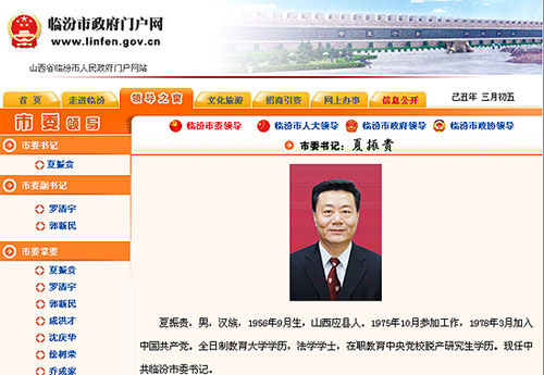 針對近日網上流傳的山西臨汾“自潰壩事故以來半年無人任市委書記”、“兩會”至今尚未召開”的信息,編輯上午瀏覽了“臨汾市政府門戶網”發現:臨汾市政府網站仍顯示夏振貴現任臨汾市委書記,羅清宇則現任中共臨汾市委副書記、代市長。